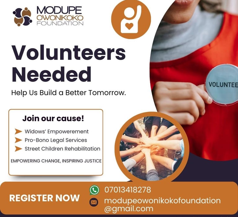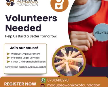 At Modupe Owonikoko Foundation, we support widows and street children, offering care and hope where it's needed most.